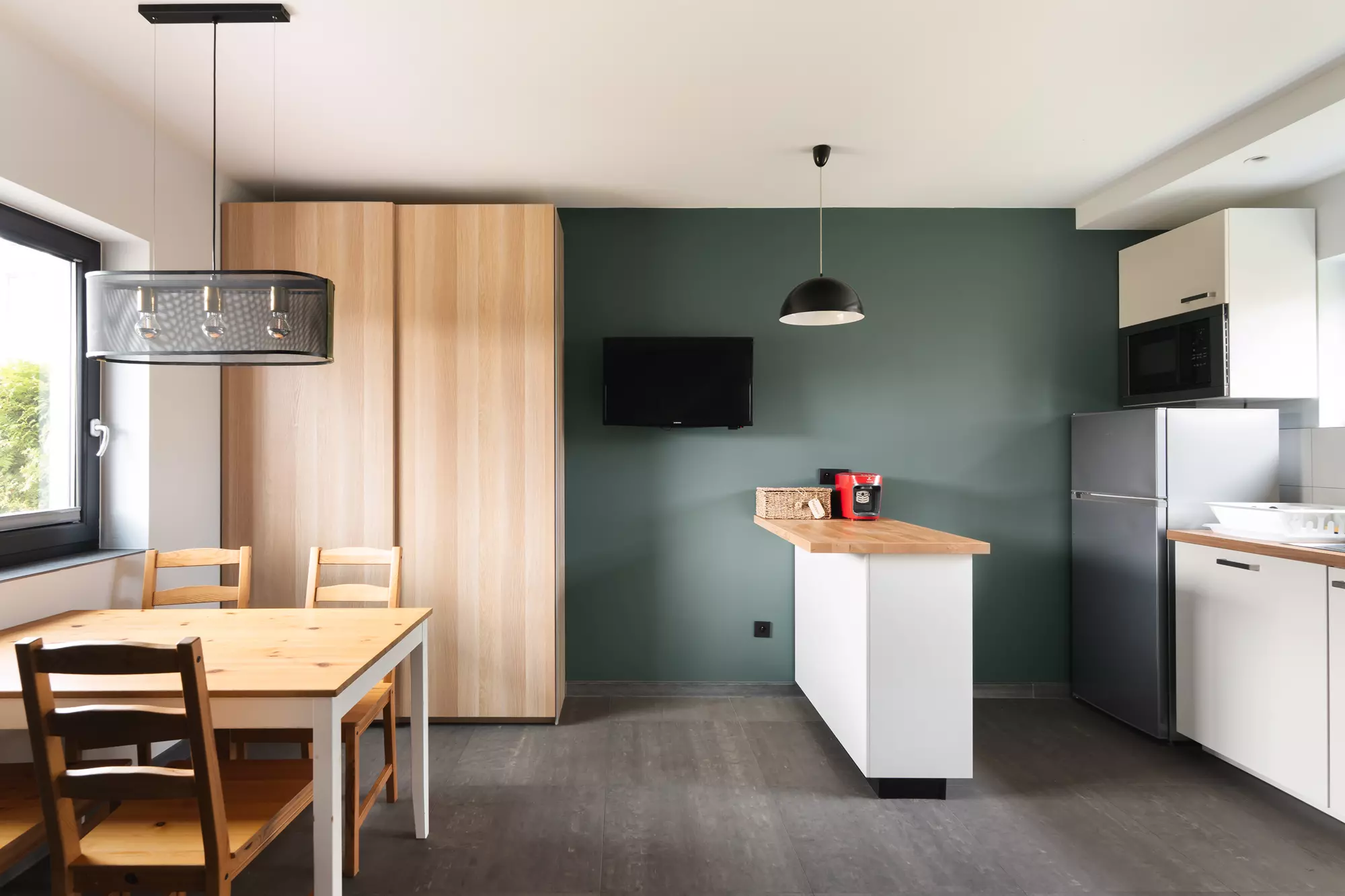 w pełni wyposażony aneks kuchenny (talerze, sztućce, szklanki, kubki, kieliszki, garnki, patelnia) z płytą indukcyjną, lodówką i mikrofalówką, czajnikiem bezprzewodowym, nowość- ekspres do kawy na kapsułki, czajnik do filtrowania wody