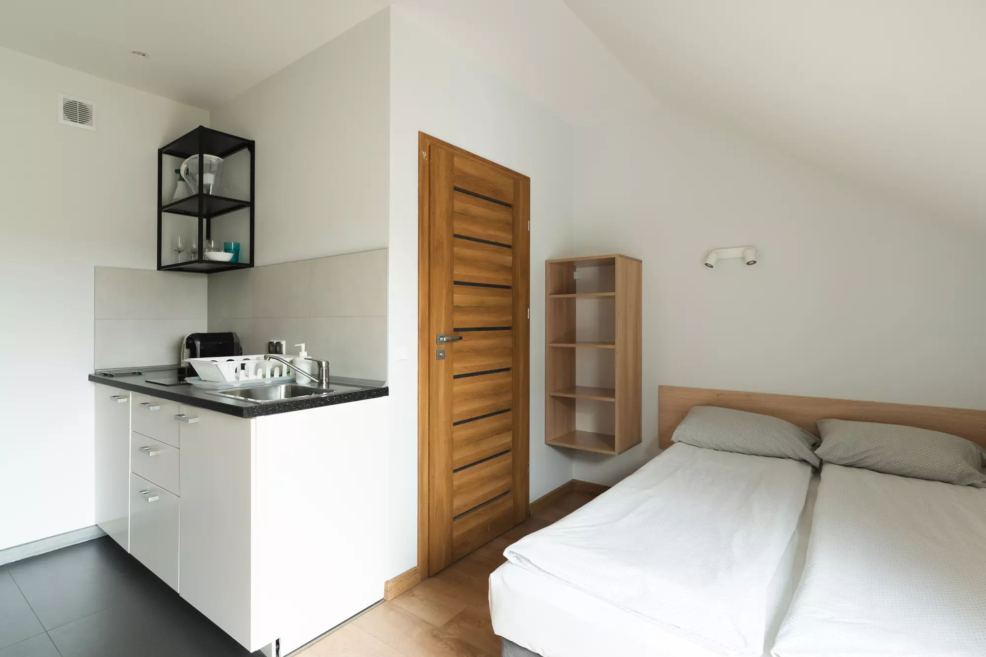 Aneks kuchenny (talerze, sztućce, szklanki, kubki, kieliszki, garnki, patelnia) z płytą indukcyjną, lodówką, czajnikiem bezprzewodowym, nowość- ekspres do kawy na kapsułki, czajnik do filtrowania wody